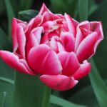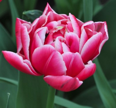 Tulpanen Columbus har enorma hallonröda pionformade blommor med vita kanter