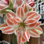 Dubbelblommande amaryllis med aprikosröda, vackert ådrade kronblad. Lång hållbarhet och utsökt från knopp till fullt utslagen blomma.