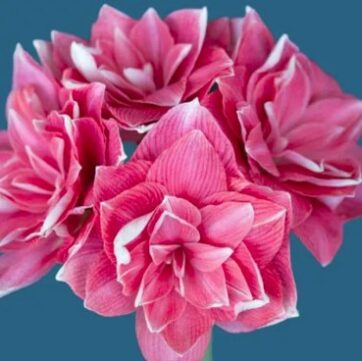 Ett enormt fyrverkeri med stjärnformade kronblad i djup rosa med vita toppar och accenter. Denna enorma dubbla amaryllis liknar en vattenlilja och varje robust stjälk bär flera fantastiska klockor.
